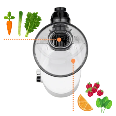 Odšťavovač vyniká svou univerzalitou, se skvělými výsledky zpracuje veškeré ovoce a zeleninu včetně kořenové a listové nebo bylinek, mladého obilí a jehličí.